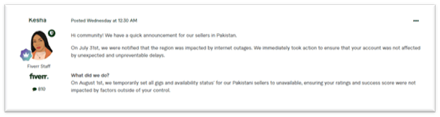 On 13th August, a Fiverr staff member posted an update explaining that they anticipated internet issues late in July and implemented a temporary unavailability status for sellers in Pakistan to reserve their ratings and scores. So, let’s hold the panic – steps were taken to preserve the viability of freelancing in Pakistan – not disrupt it.